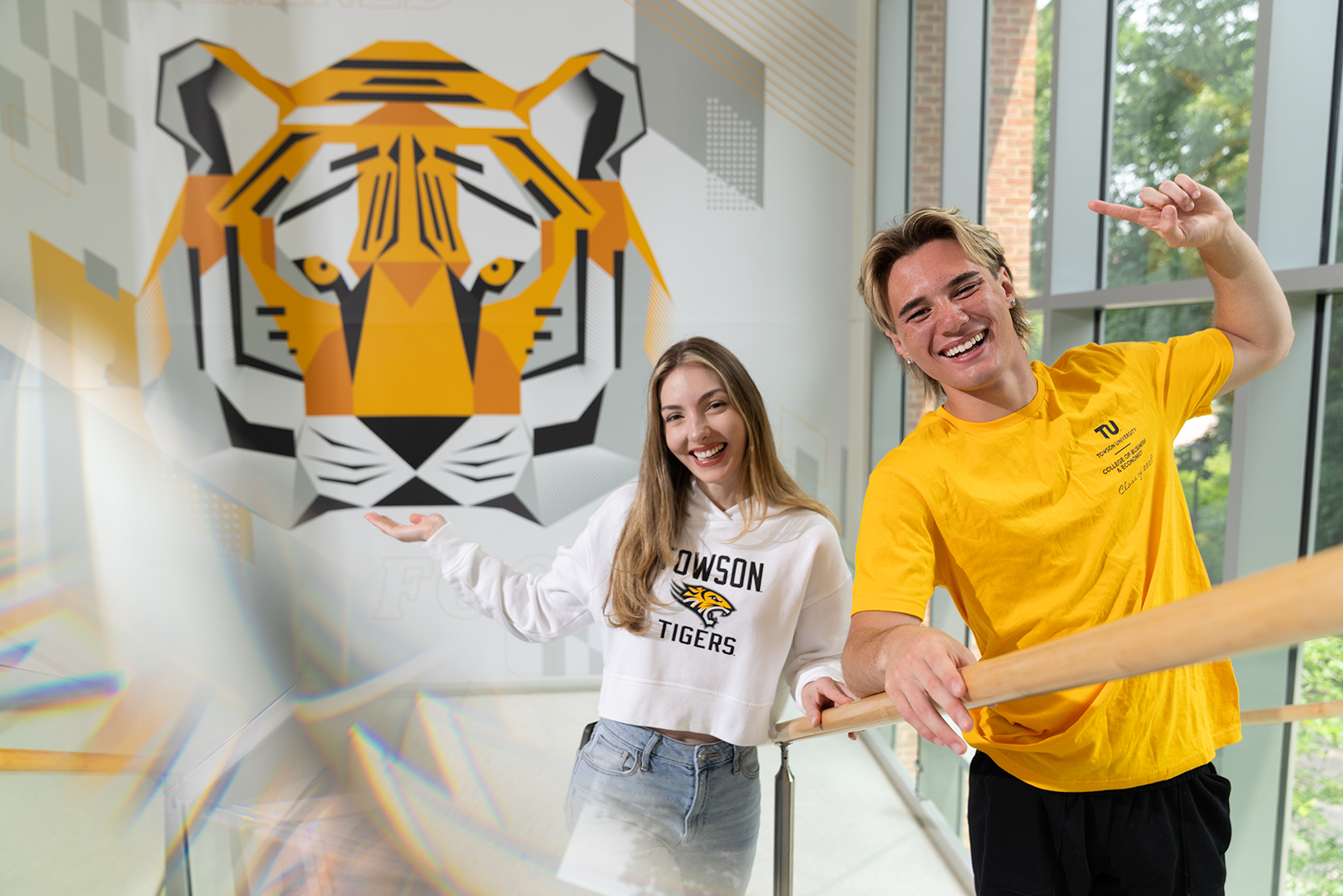 Two Towson University Students point to their Towson Tiger. A prism in front of the lens creates abstract shapes and colors that aid in the interest and creativity of the image.