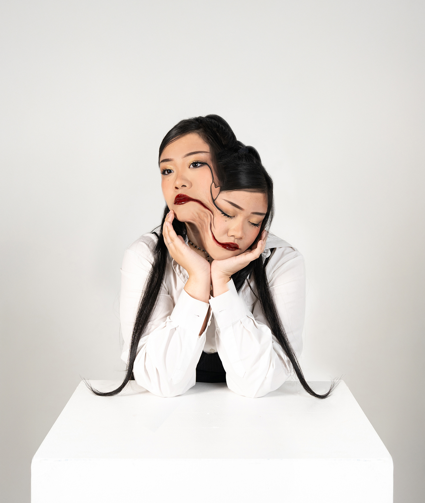 A woman rests her chin in her hands, eyes closed, as another version of her face emerges, eyes open, fused. Set against a brutally minimalist and sterile environment, the image evokes surreal tension.