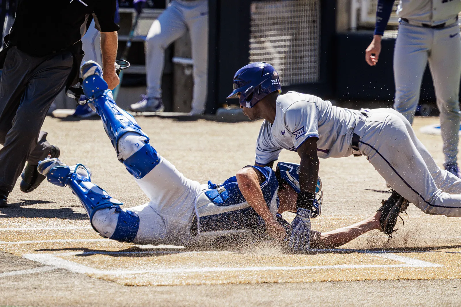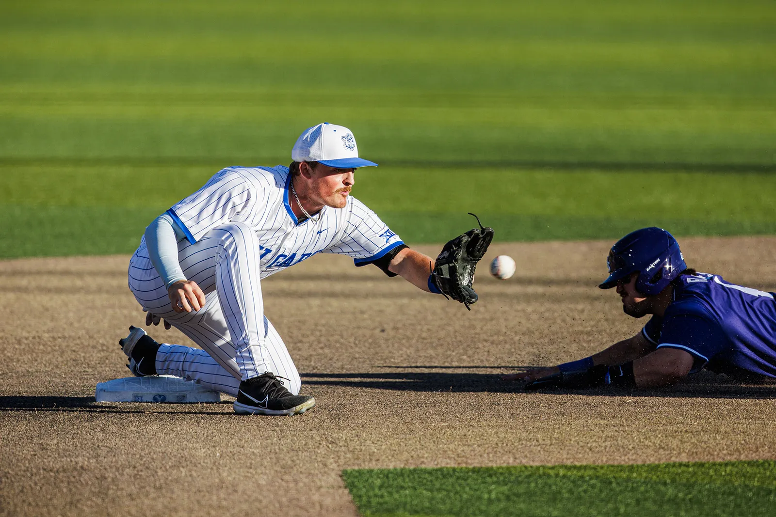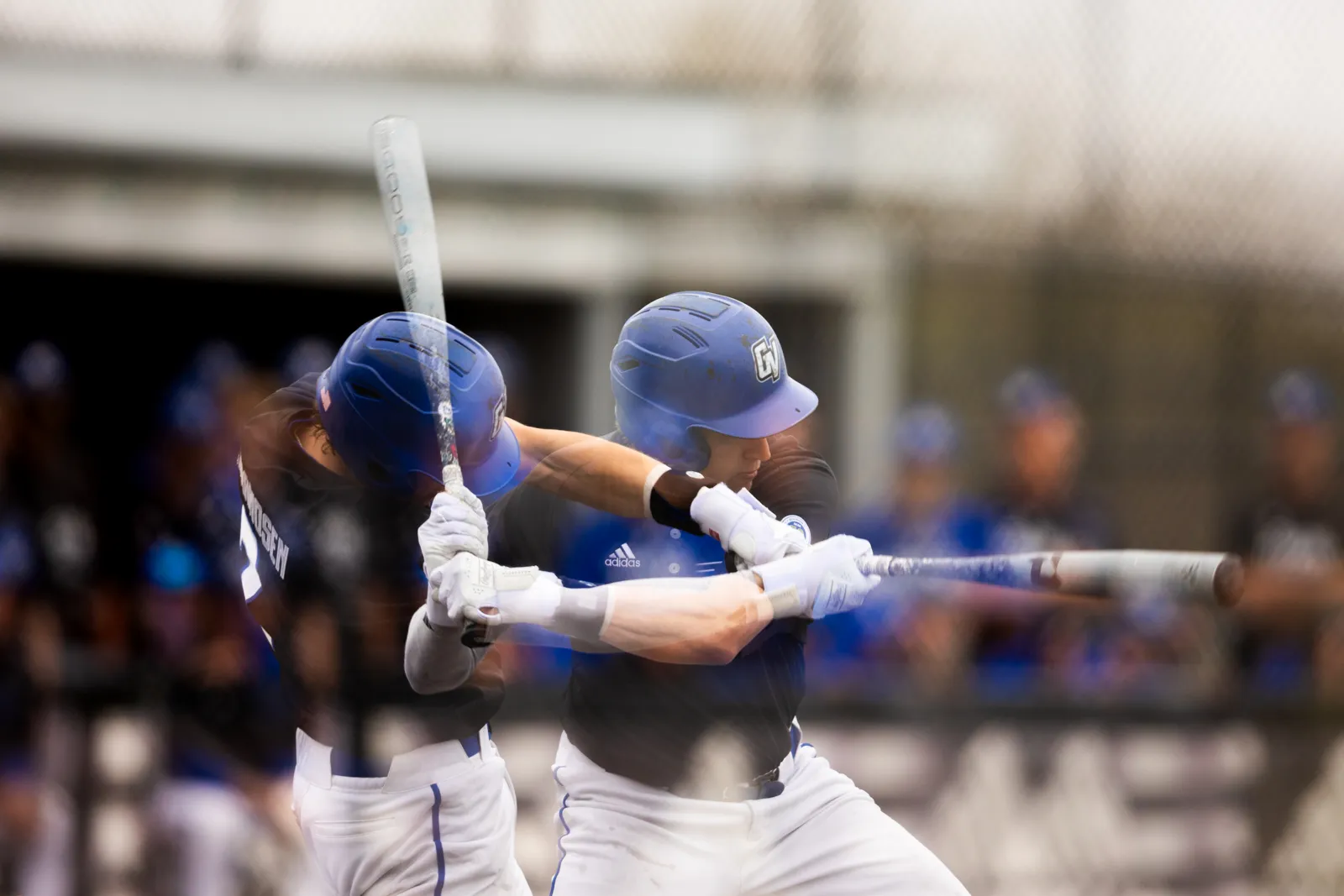 In the in-camera double exposure shot with a Canon R6, from a game against Wayne State University, Jonas Gulbrandsen is captured at bat, showcasing the fluid motion of his swing.