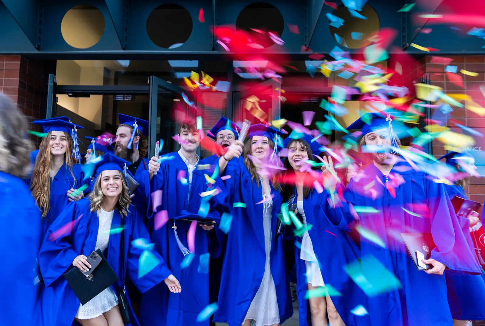 A group of film and video graduates celebrate their graduation by throwing confetti after the Saturday afternoon Commencement at the Van Andel Arena on April 26.
