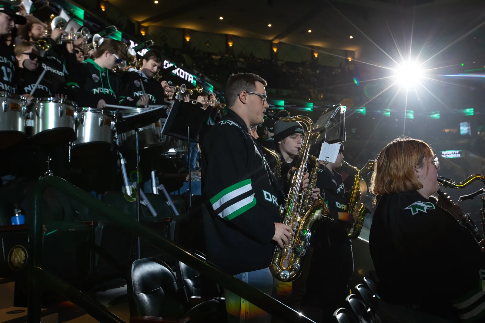 The University of North Dakota Band plays during the intro of a Hockey Game.
