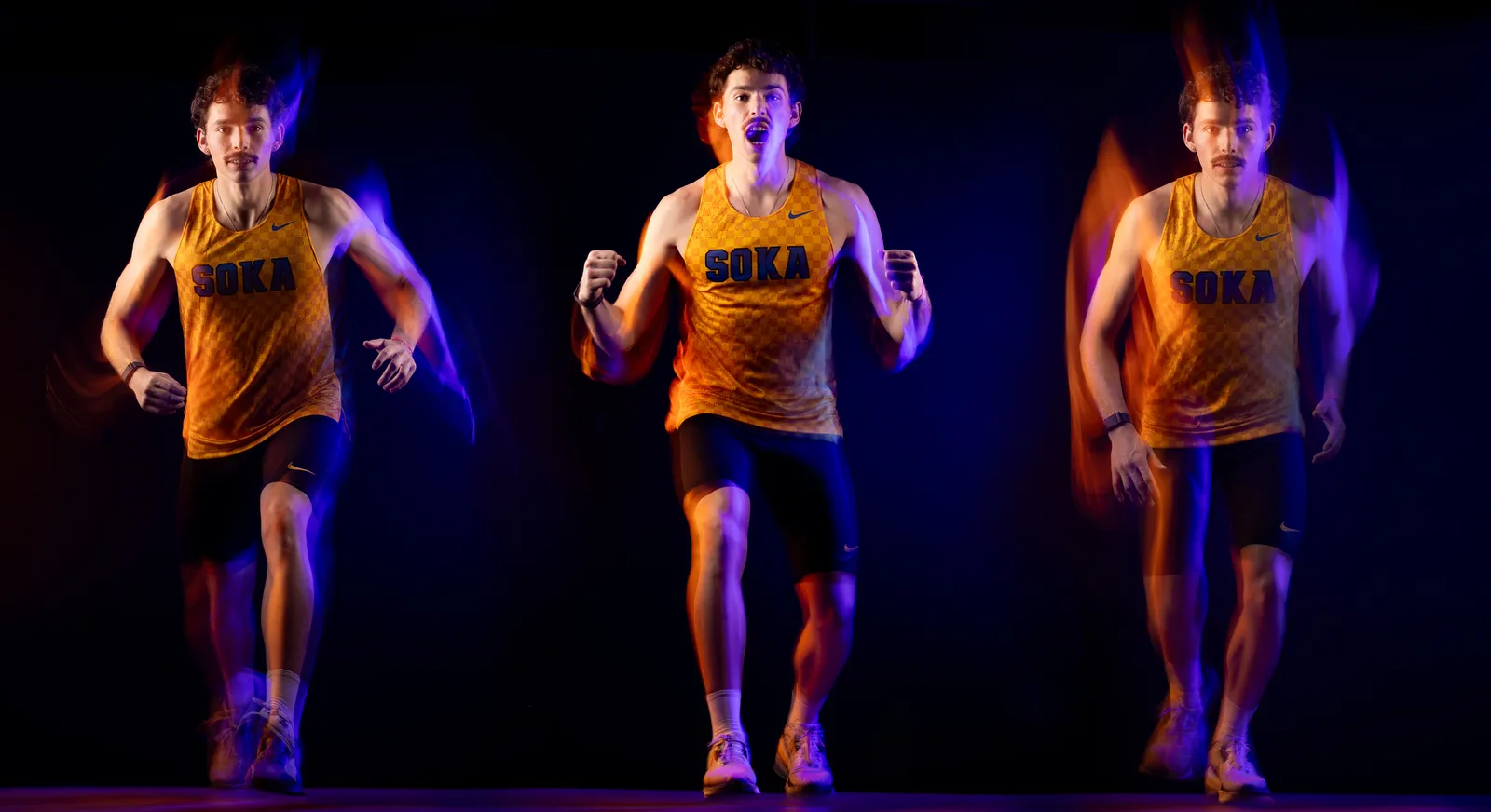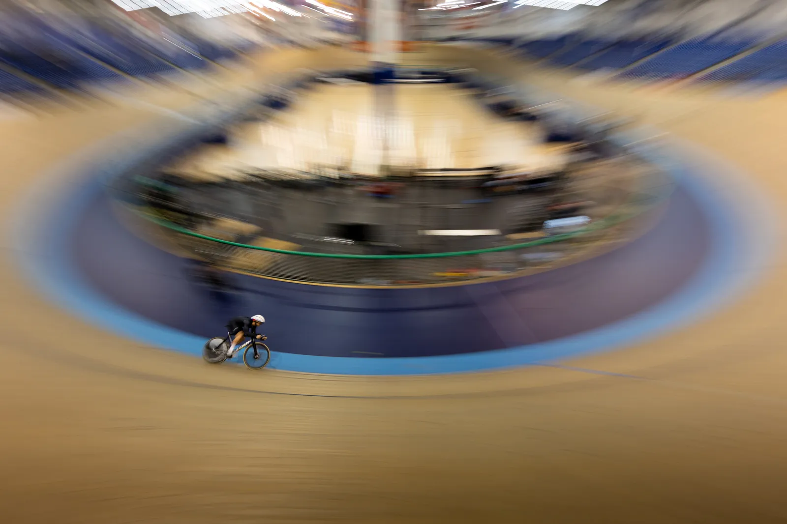 A track cyclist from the USA cycling Search for Speed program is captured in a pan shot as he rounds the corner in a flying 200 meter test
