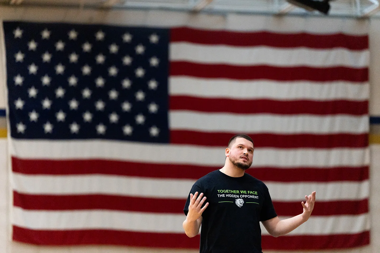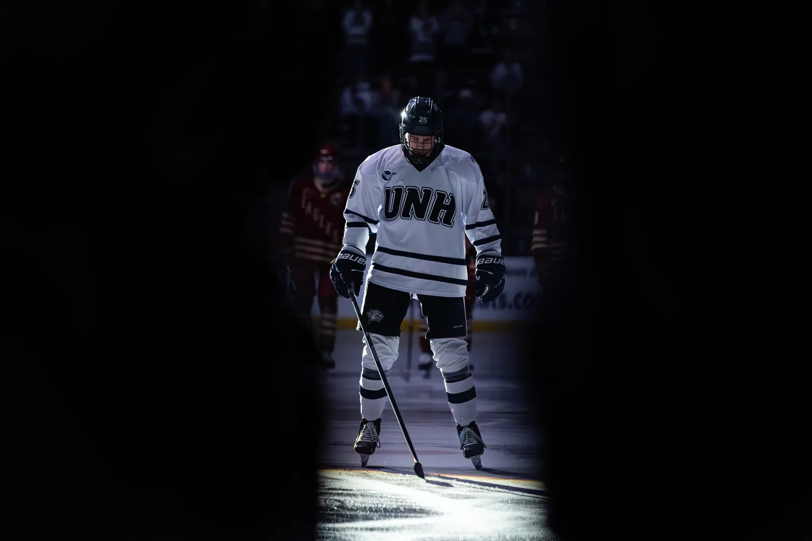 Morgan Winters, #26, of UNH Men's Hockey stands for the starting lineup announcement before a game against the Boston College Eagles on February 7th, 2025 at the Whittemore Center Arena in Durham, NH.