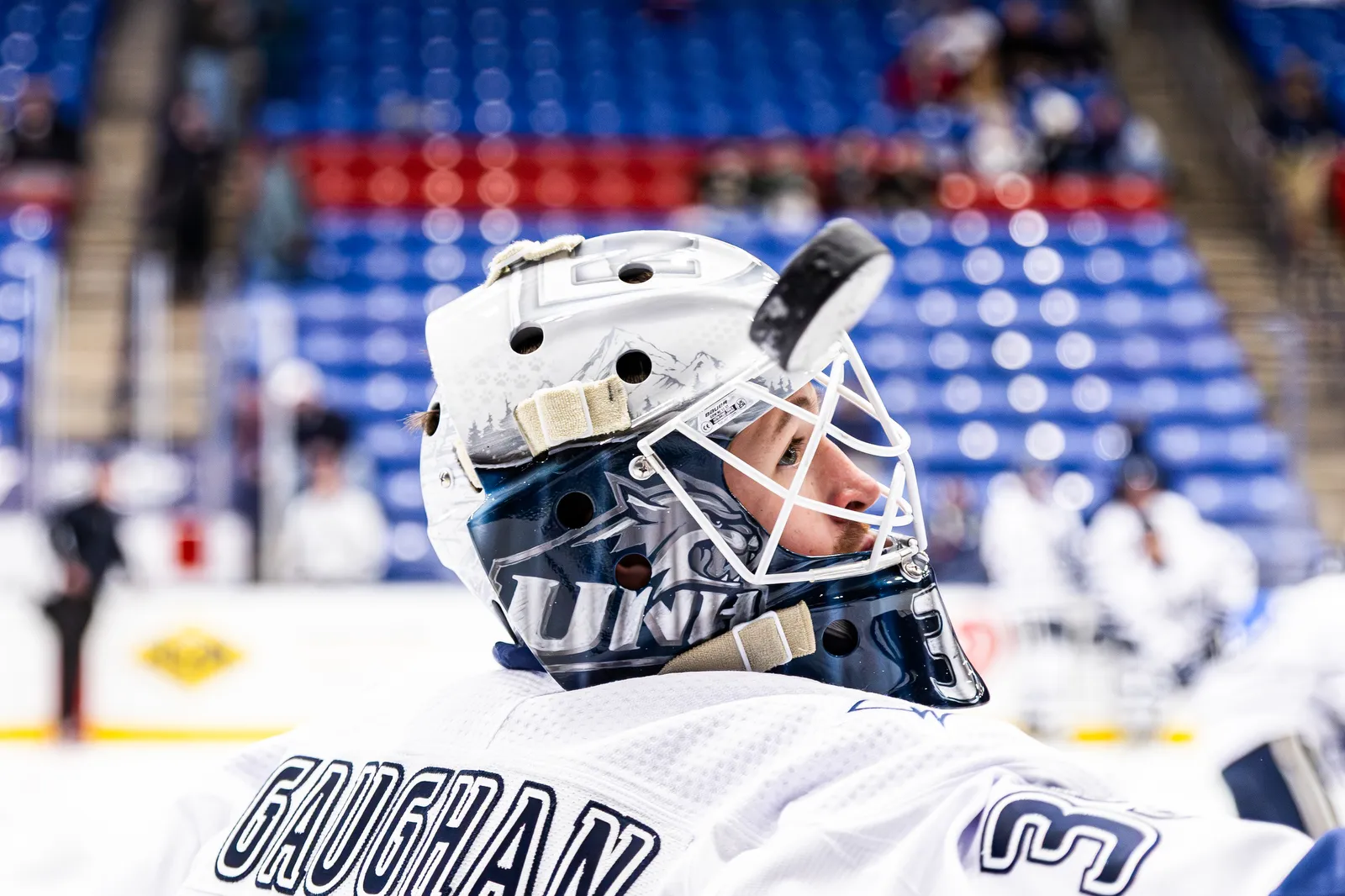 Raphael Gaughan, #35, of UNH Men's Hockey attempts to catch a puck during warmups against the University of Massachusetts on February 21st, 2025 at the Whittemore Center Arena in Durham, NH.