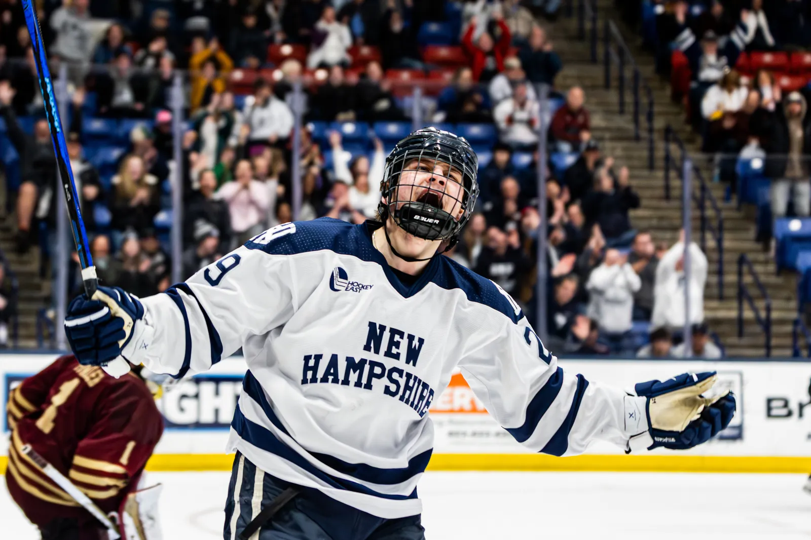 Cy LeClerc, #29, of UNH Men's Hockey screams in celebration after scoring the game winning goal in a penalty shootout against the University of Massachusetts on February 21st, 2025 at the Whittemore Center Arena in Durham, NH.