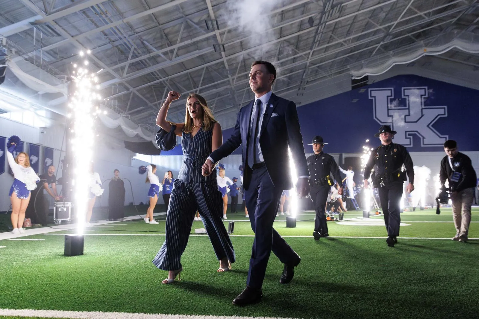Will Stein is introduced during a press conference at the University of Kentucky’s indoor practice facility as pyrotechnics ignite along the entrance. He walks onto the field alongside a guest while cheerleaders and staff look on, marking the beginning of a new chapter for the program.