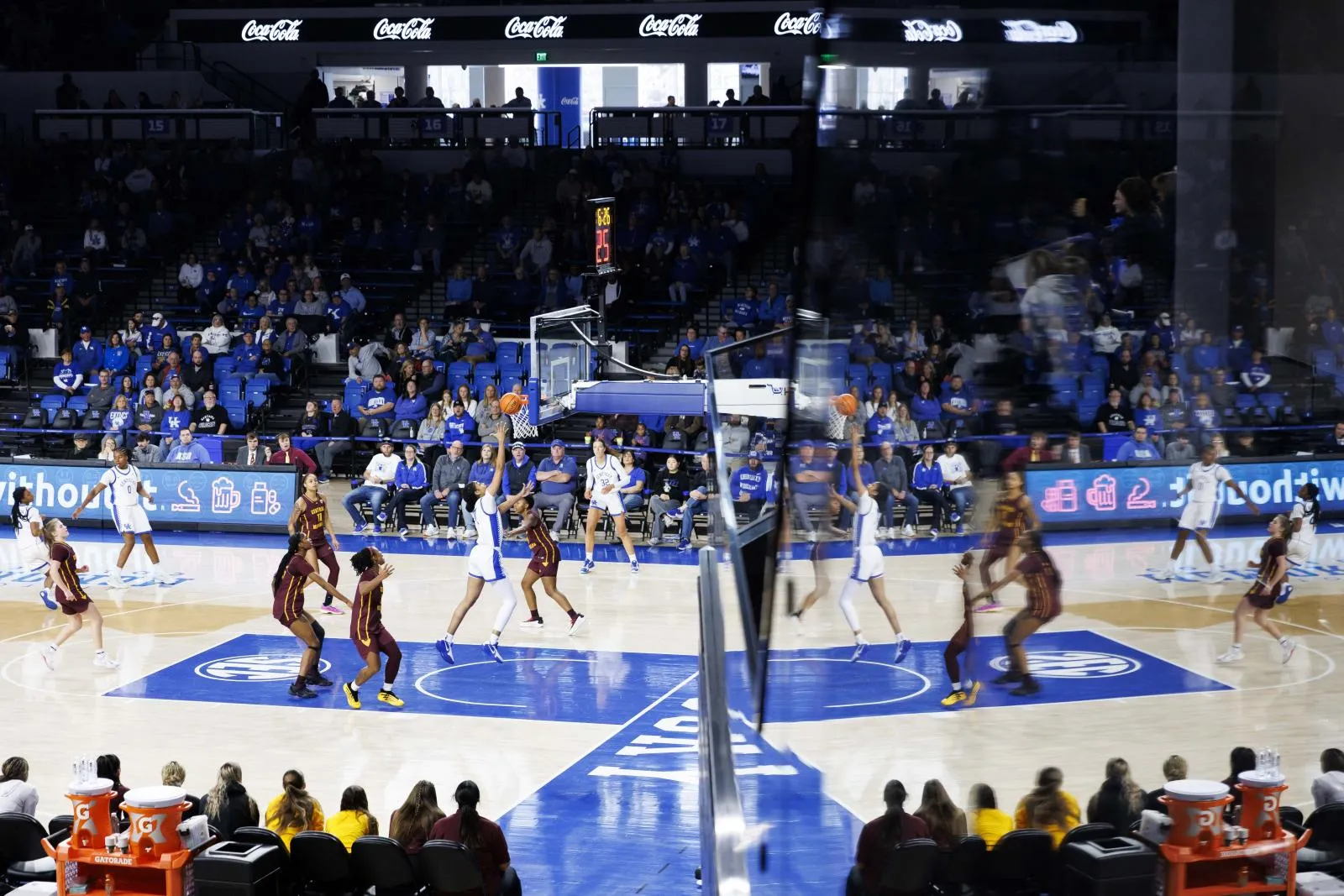 A Kentucky player drives toward the basket during a women’s college basketball game at Memorial Coliseum, with the action reflected in the glass behind the hoop as defenders close in and fans watch from the stands.