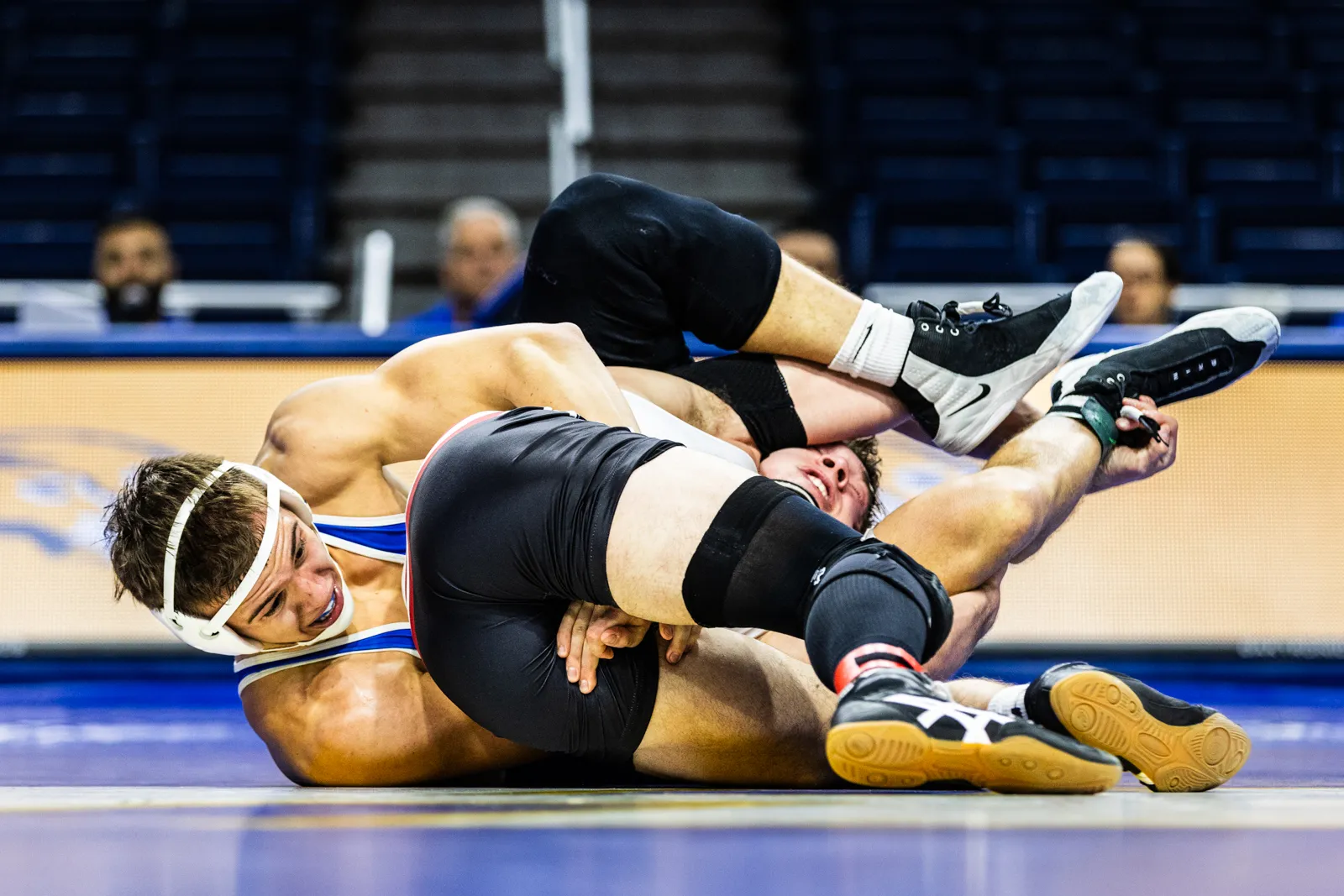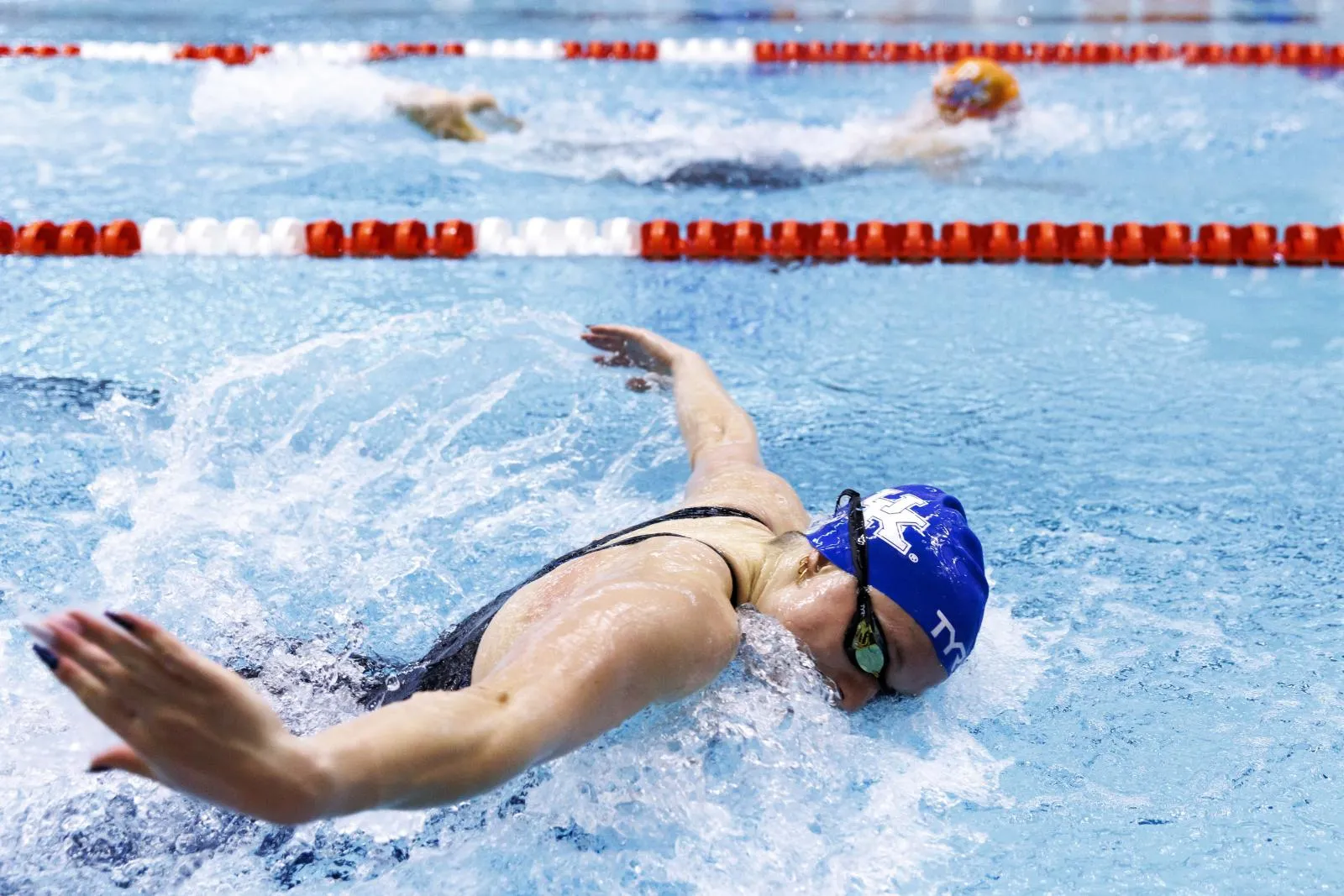 A Kentucky swimmer powers through a freestyle race during a collegiate swimming meet, cutting through the water with a strong stroke as competitors race in adjacent lanes.
