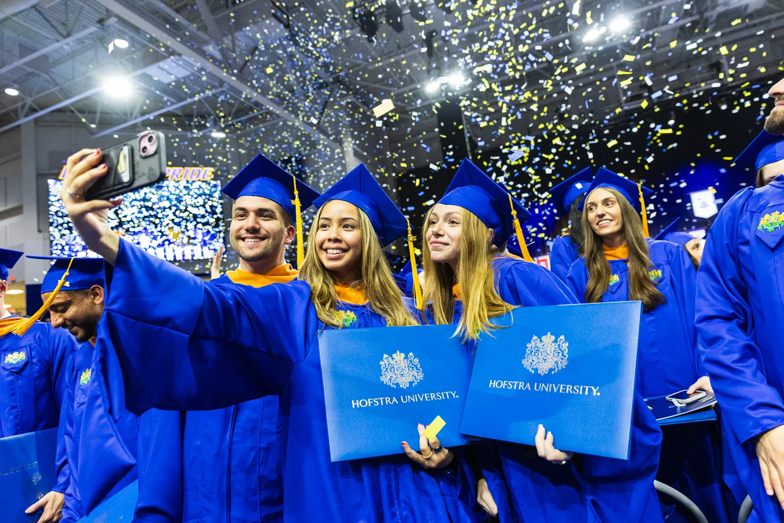 Students pose for a selfie as the confetti falls at the conclusion of mid-year commencement