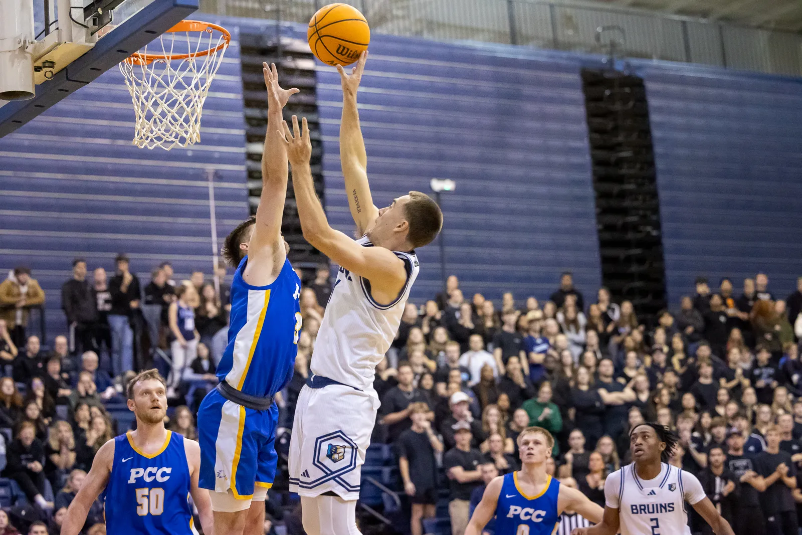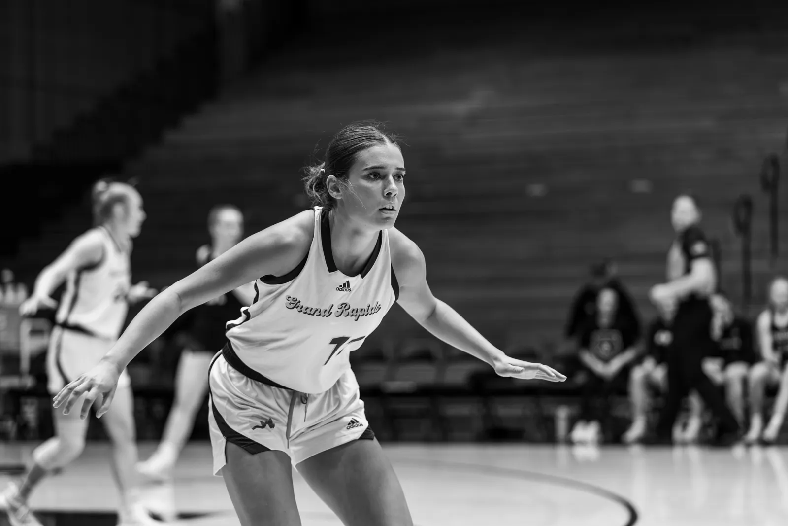 Grand Valley State University women’s basketball guard Ellie Droste stays focused as she tracks her University of Wisconsin-Parkside opponent, keeping her eyes locked on every move.