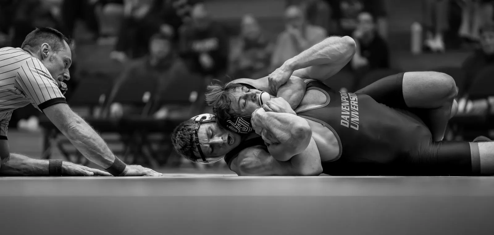 Grand Valley State wrestler has Davenport opponent in a chokehold while Ruff scans for points on February 1st.