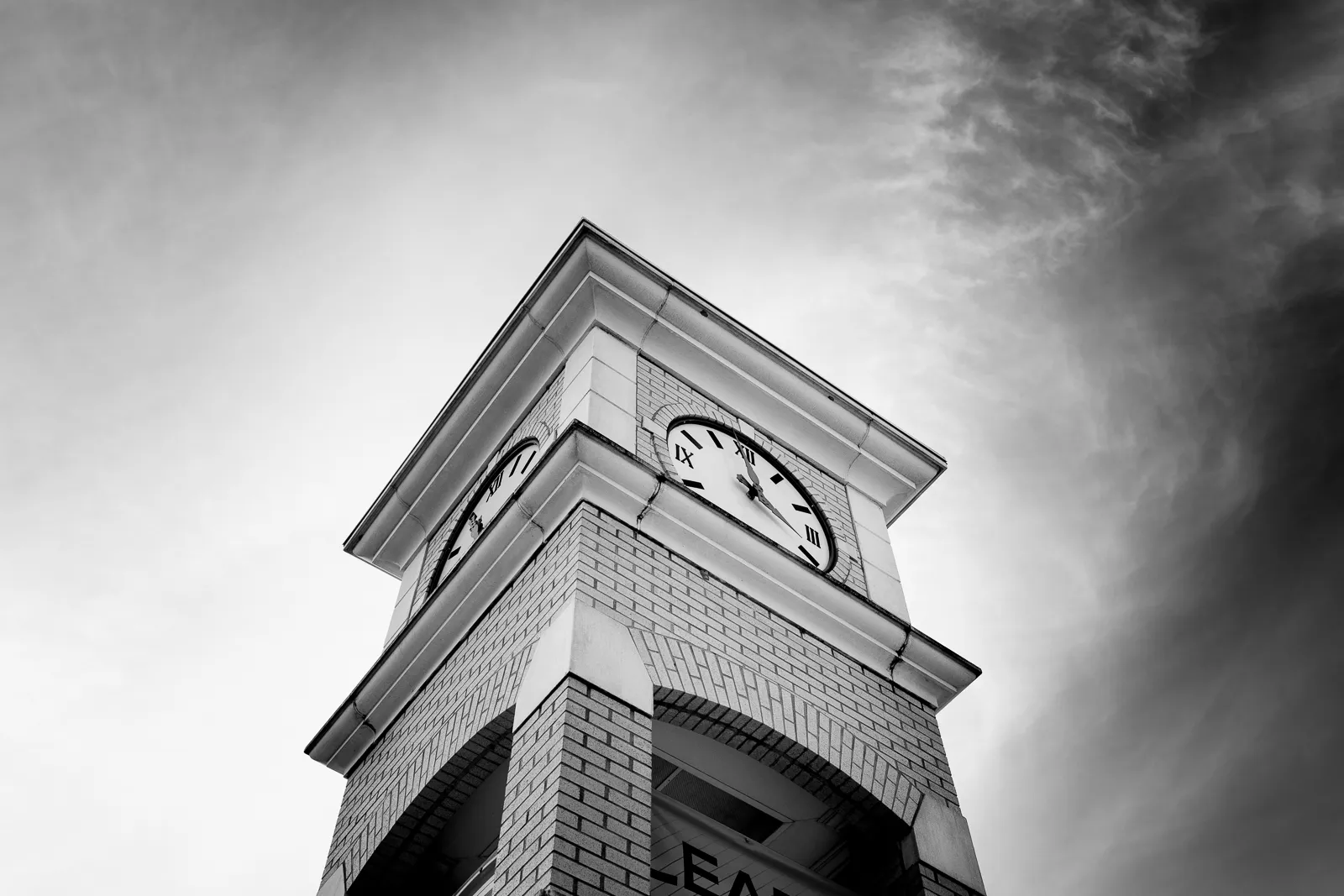 This black and white image captures the historical aspect of a very well-known, well-loved clock on campus.