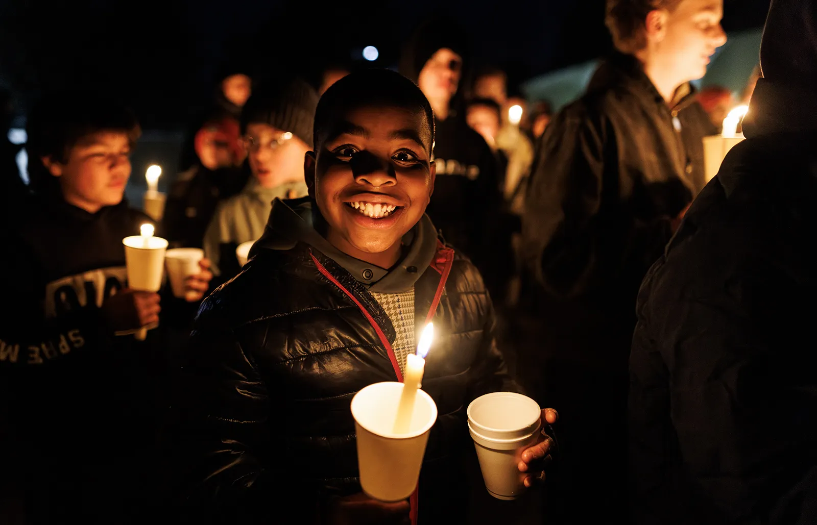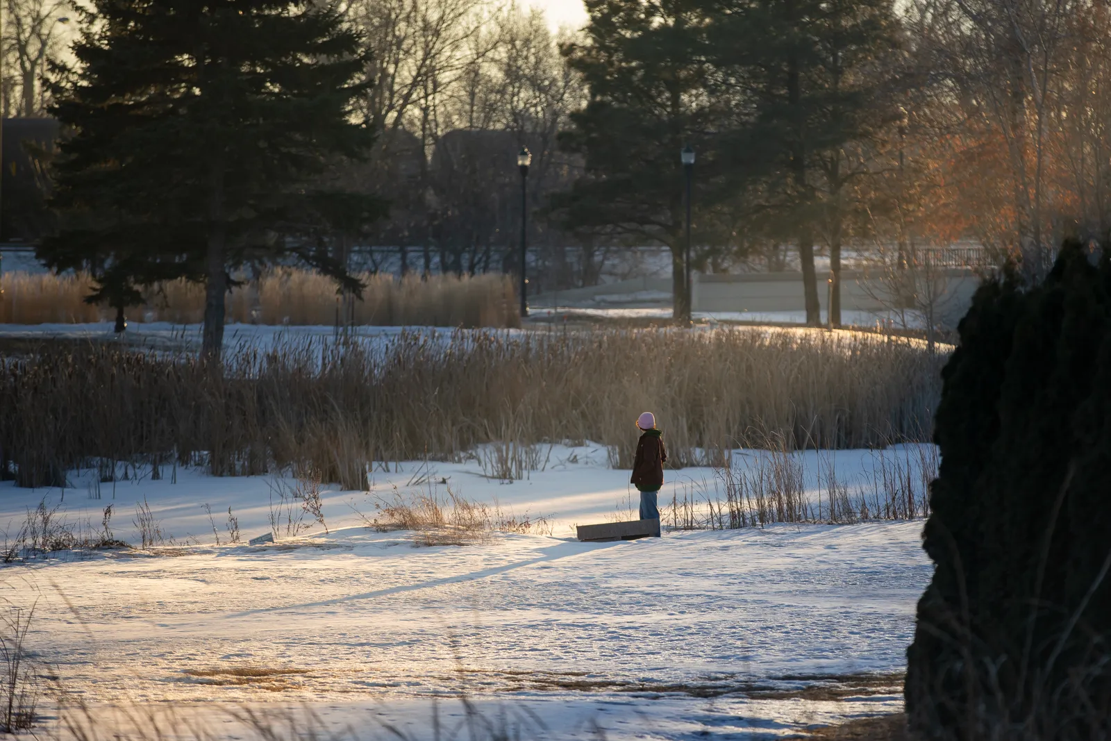 A student stands tall in a snowy field, basking in the late afternoon sun.