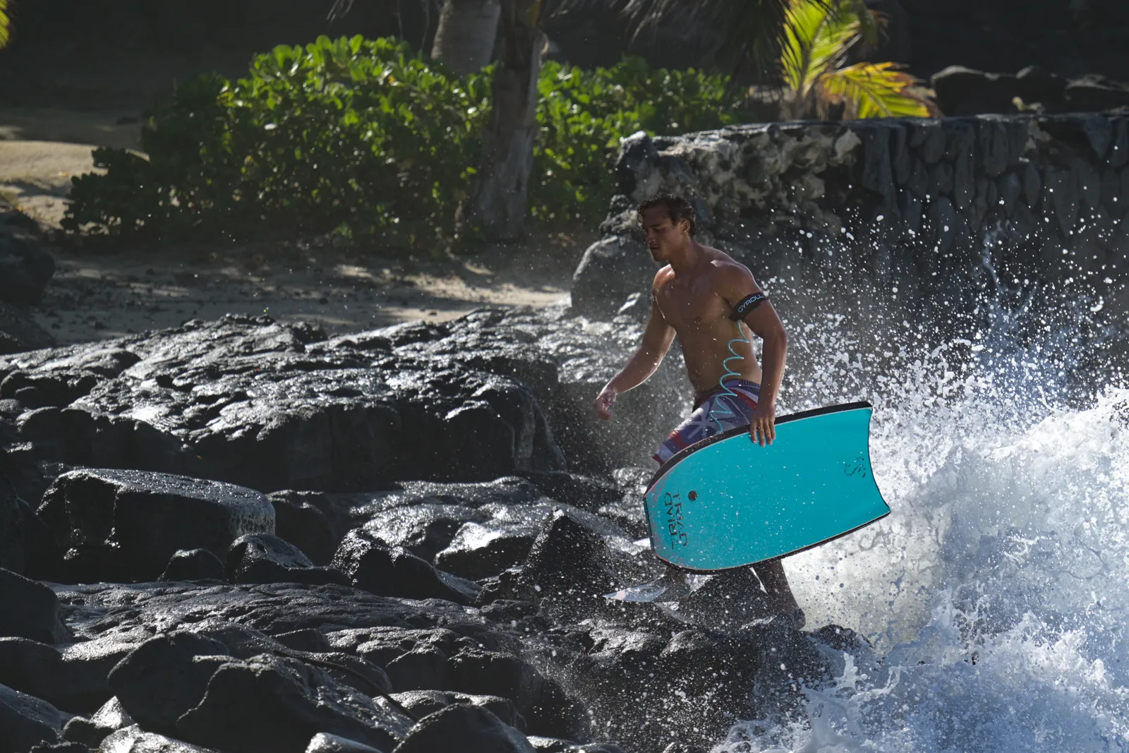 A boogie boarder emerges from the water as waves splash dramatically behind him.