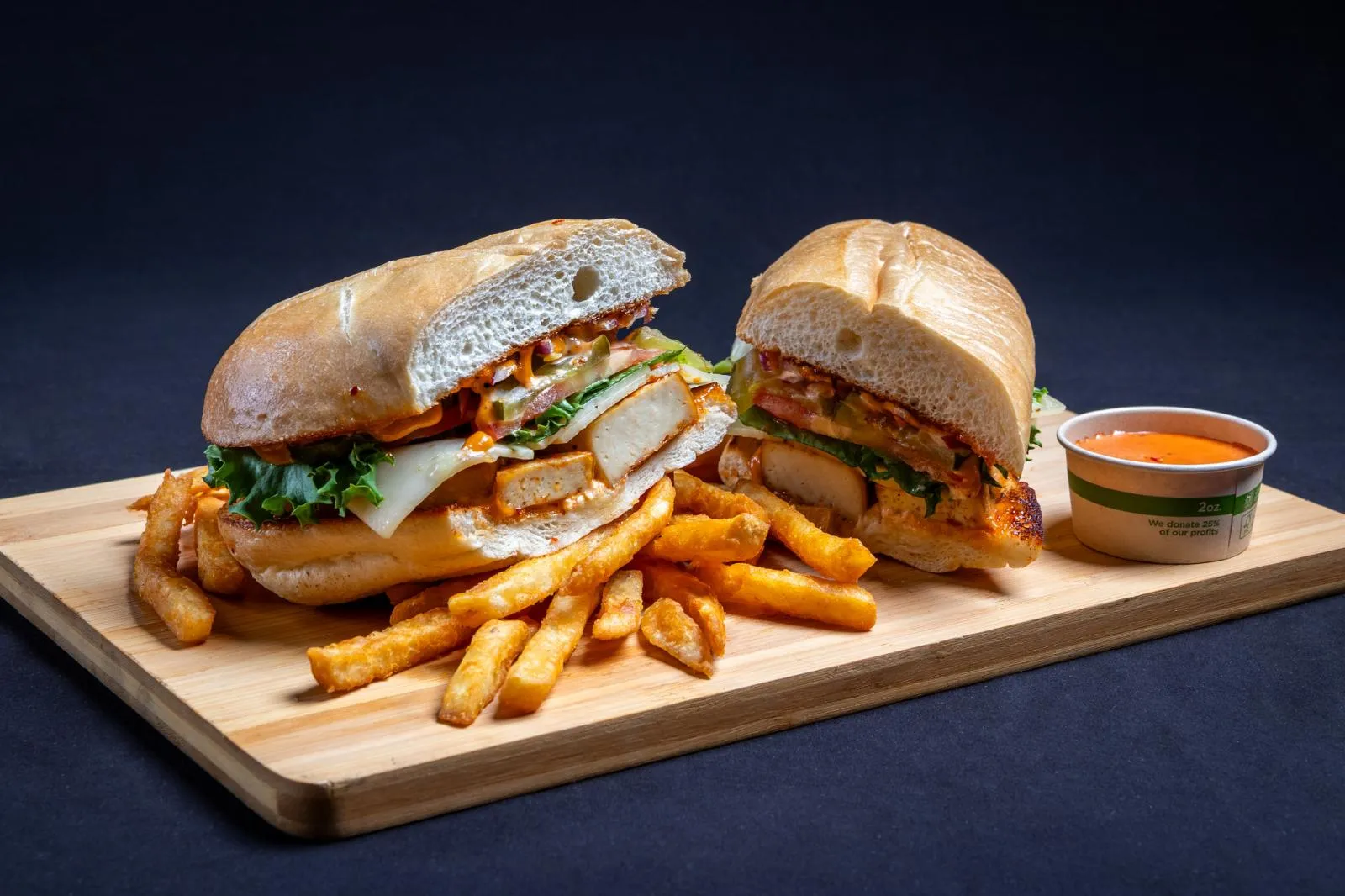 Promotional image of a tofu sandwich taken for an on-campus deli.