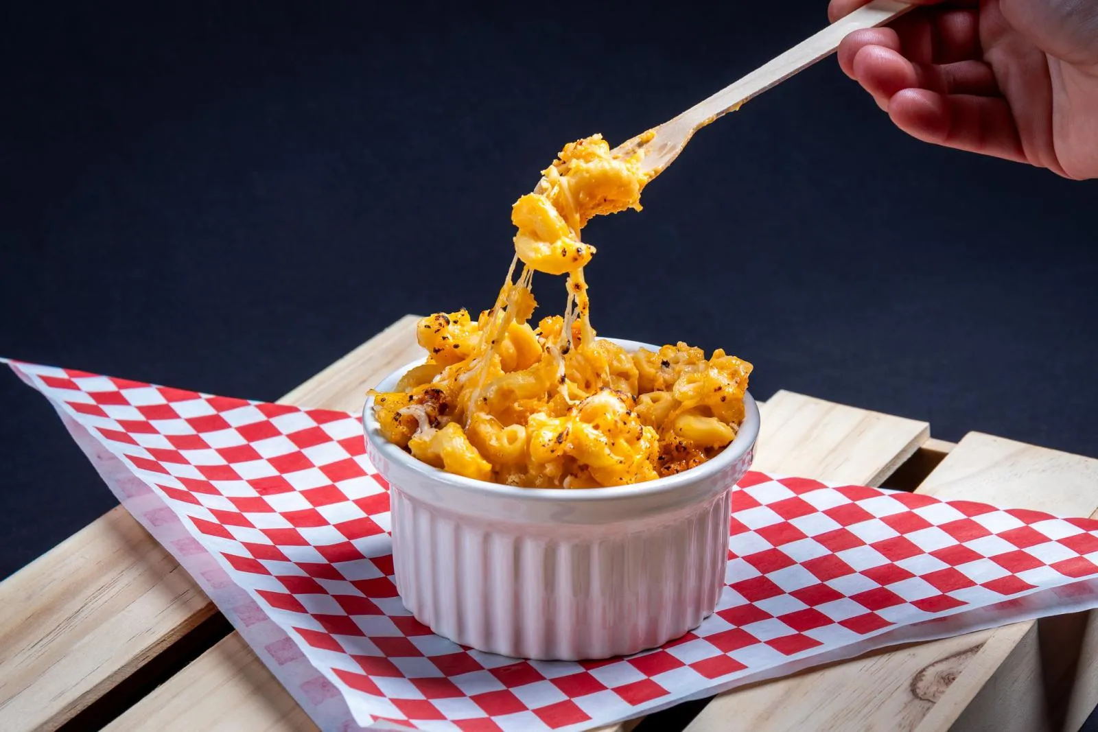 Promotional image of a mac & cheese taken for an on-campus deli.
