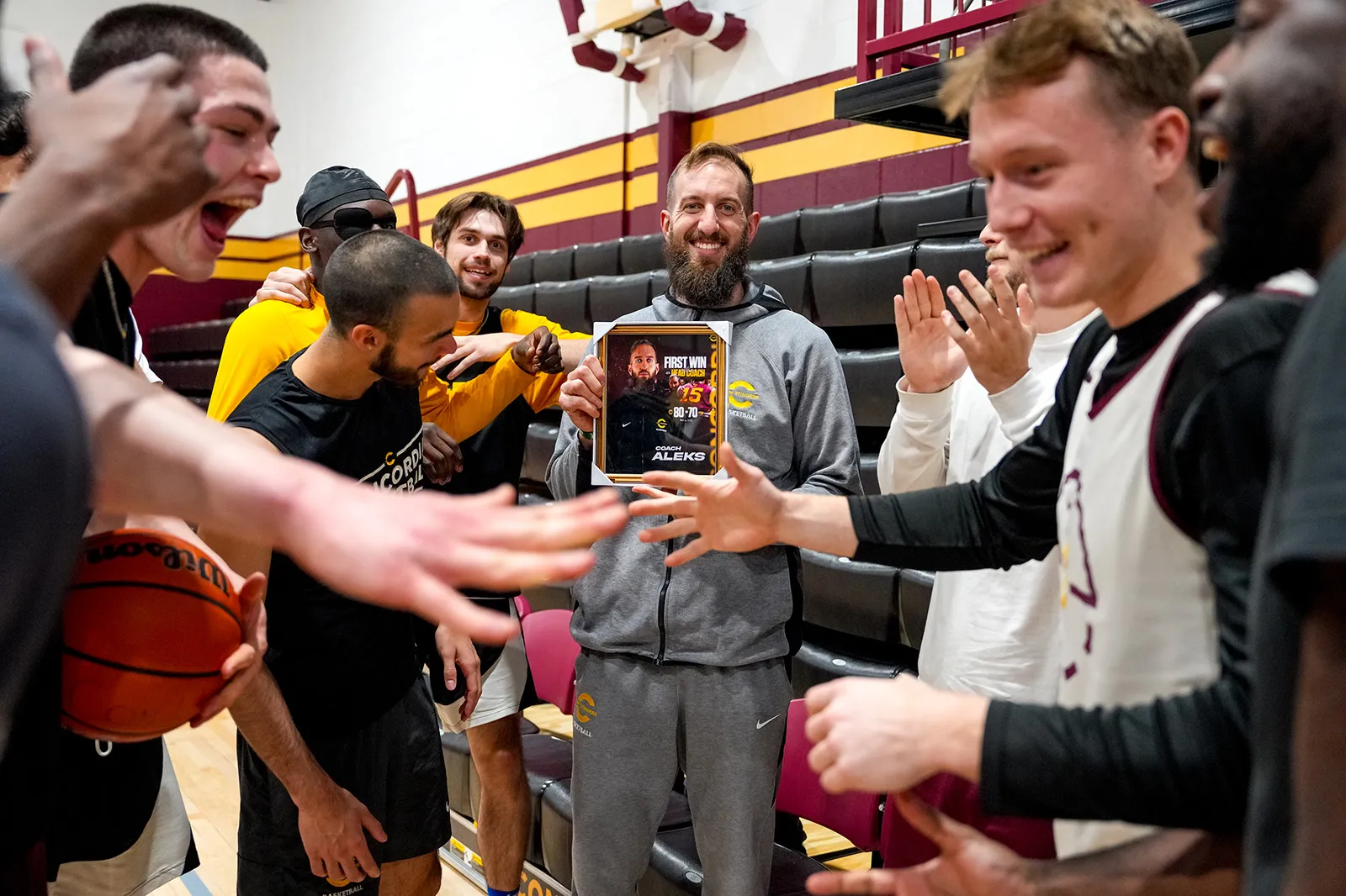 Coach smiles with his gift, awkwardly, while his players celebrate. Coach Aleks took over midseason due to a personal leave by the existing Head Coach.