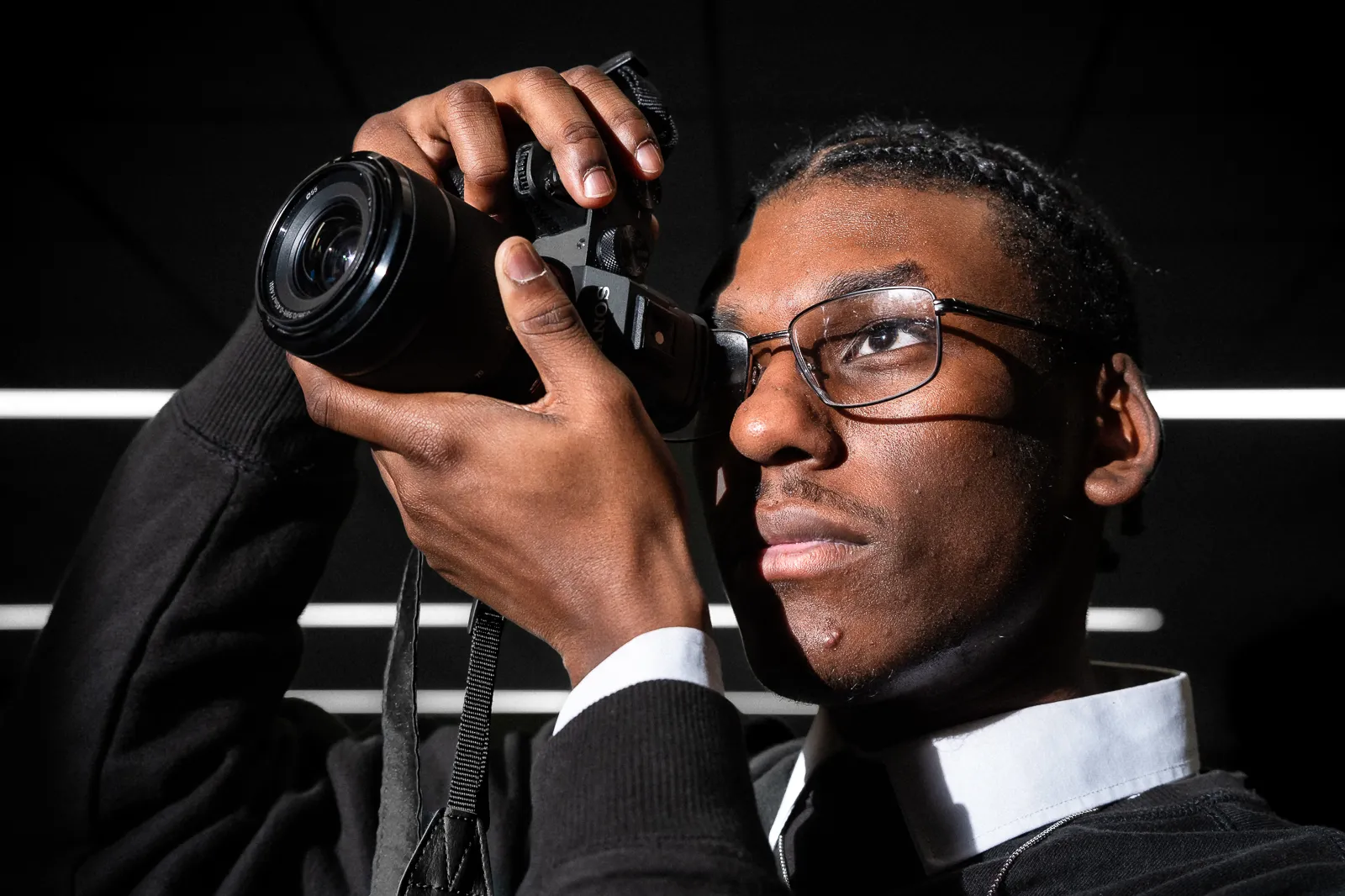 A young student with aspirations of becoming a personal trainer works out during a branding photoshoot.