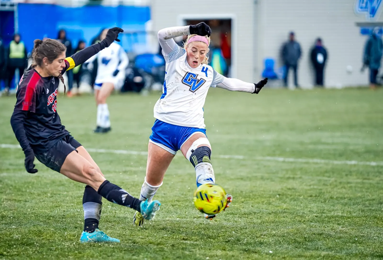 A Grand Valley State University woman soccer player and her Drury opponent engage in a fierce footrace, each determined to claim control of the ball in this thrilling NCAA-II matchup for the Regional Championship title.