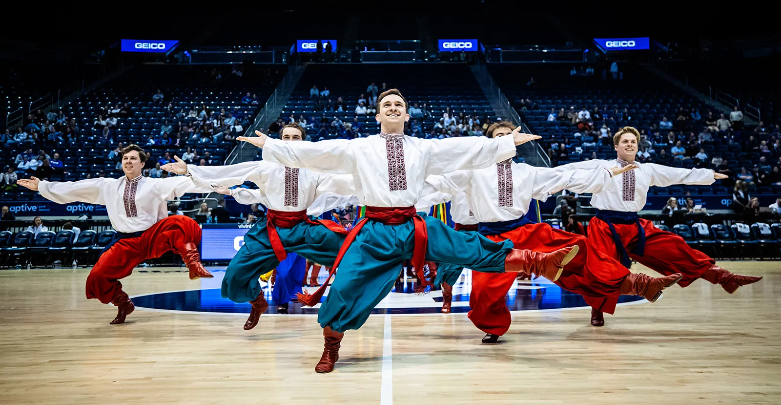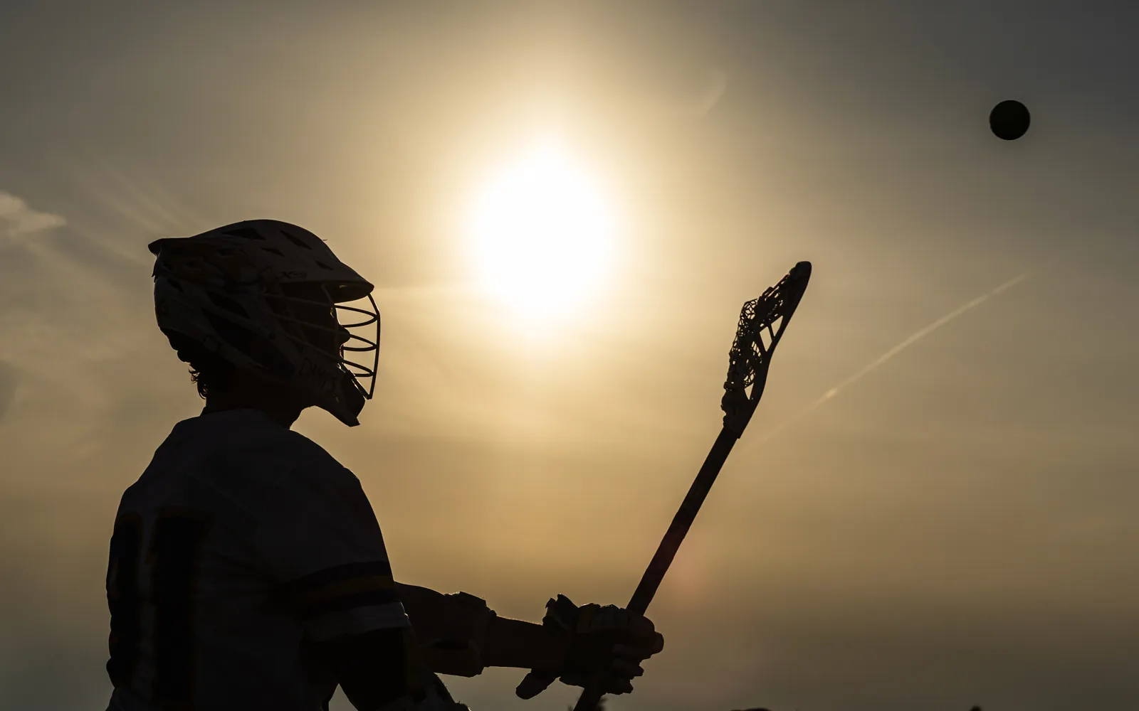 Drew Bogardus of the Hofstra University Men's Lacrosse Team passes the ball during warmups with the sun setting in the background