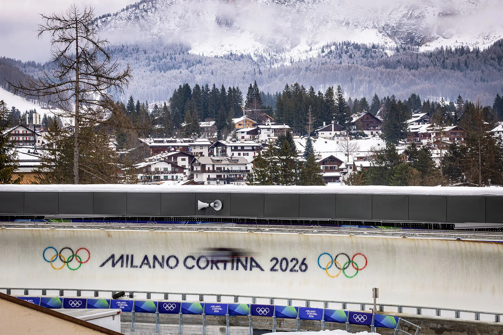 Skeleton athlete competes against the beautiful Cortina mountains at the 2026 Winter Olympics.
