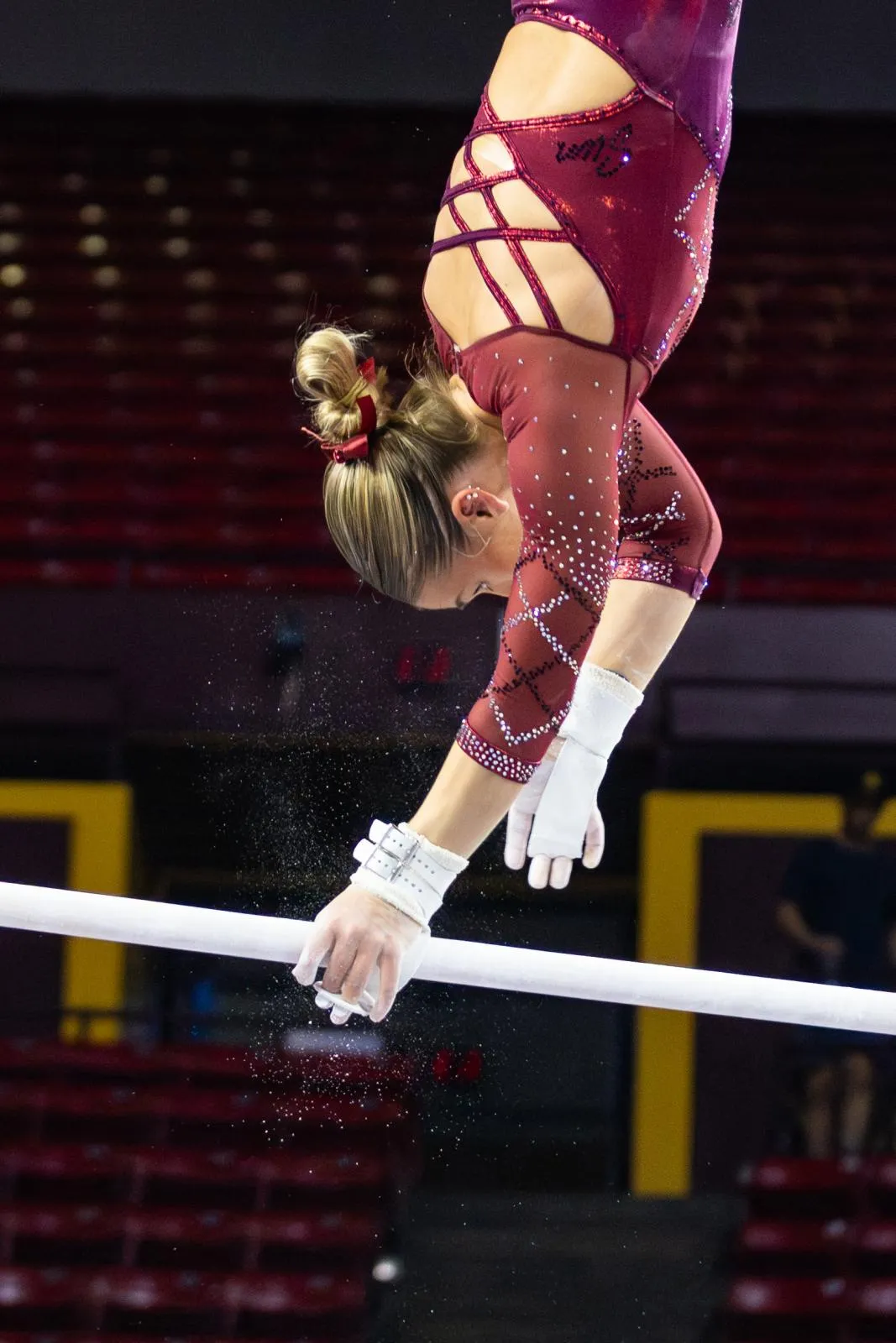 ASU gymnast swings on the uneven bars during the ASU vs Denver gymnastics meet in Tempe, Ariz.