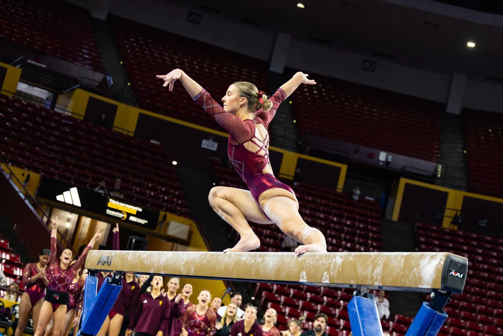 ASU gymnast performs a routine on the balance beam during the ASU vs Denver gymnastics meet in Tempe, Ariz.