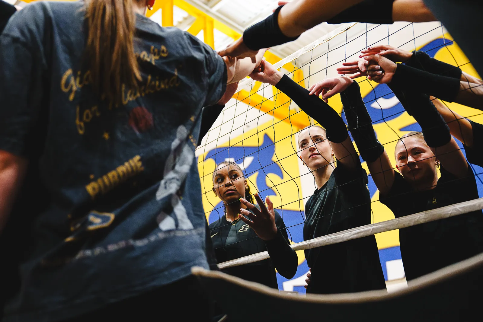 Graduate middle blocker Lindsey Miller leads the Purdue Boilermakers Volleyball team huddle before their match against Southern Methodist University in the NCAA Sweet Sixteen.