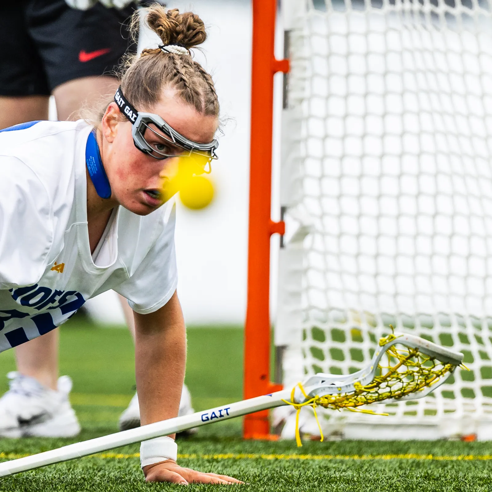 Kayleigh Bender of the Hofstra University Women's Lacrosse Team eyes the ball that fell out of her hands after she is knocked down by a defender