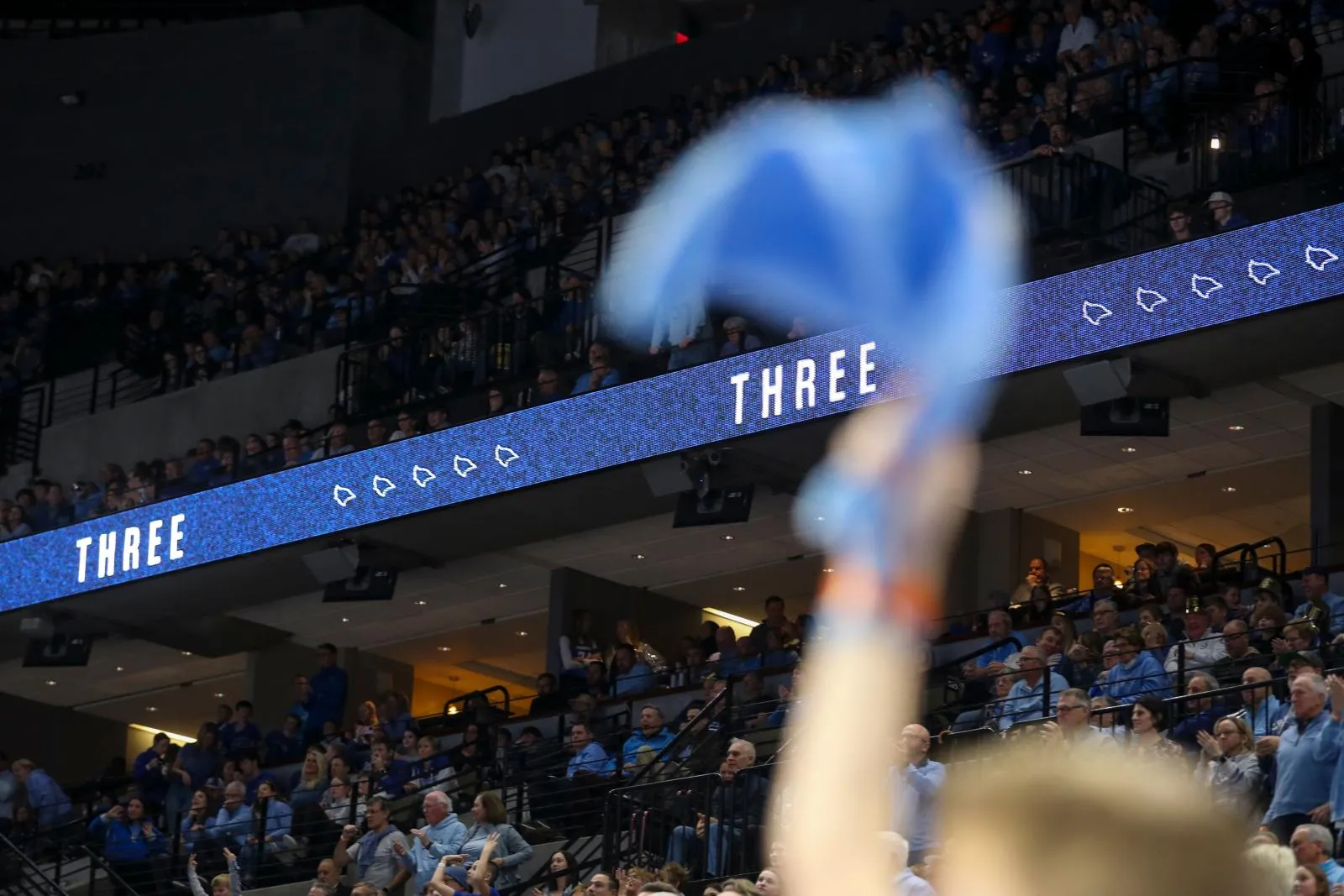 Courtside celebration during the Powder Blue Out game celebrating a three.
