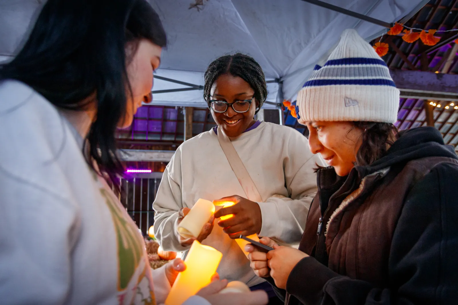 Student volunteers turn on the electric candles they are using as part of a shrine for a Dia de los Muertos celebration.