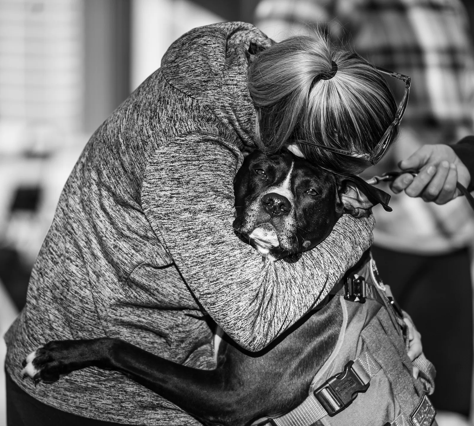 A woman hugs a dog before the start of a Ruck March across Kent's campus to raise money to help connect veterans with pets.
