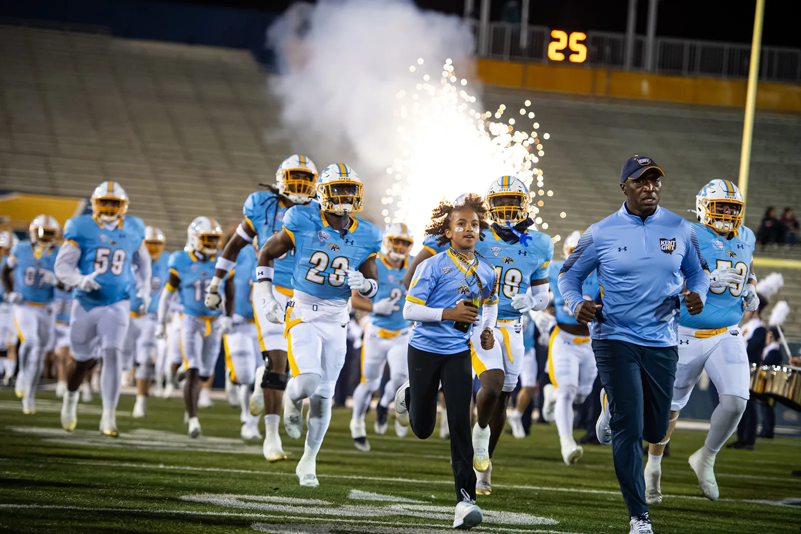 Kent State head coach Kenni Burns and his daughter lead the football team onto the field before the wagon wheel game against Akron.