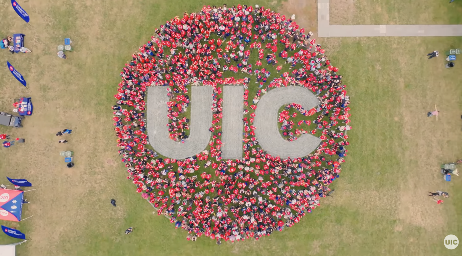 On August 27, UIC celebrated the arrival of first-year and transfer students during the first week of the semester at its annual Convocation. After the cheering for thousands of new UIC Flames, the afternoon kicked off with a welcome from USG President Nathan Thokkudubiyyapu at Harrison Field. New students were provided with red UIC bucket hats and t-shirts before they assembled into the shape of the UIC circle logo mark.